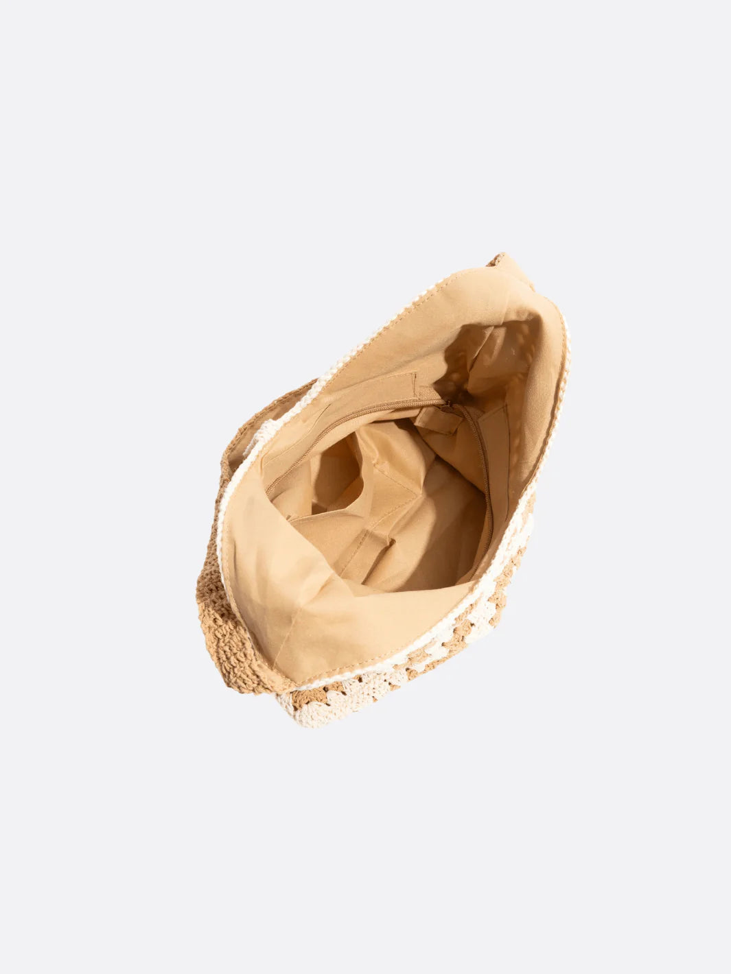 Boho-Chic & Practical – Handcrafted crochet in natural tones with a modern triangular silhouette.