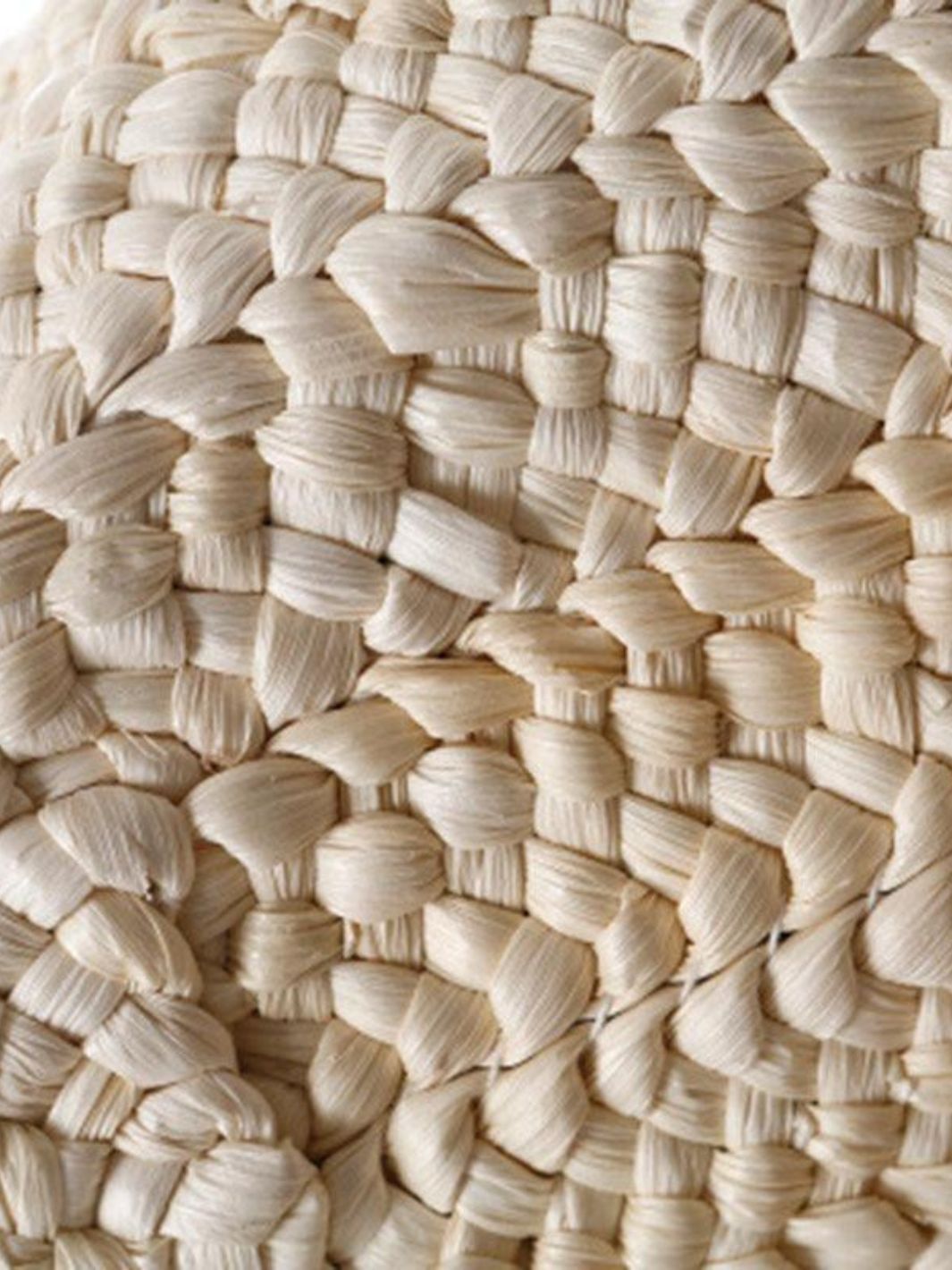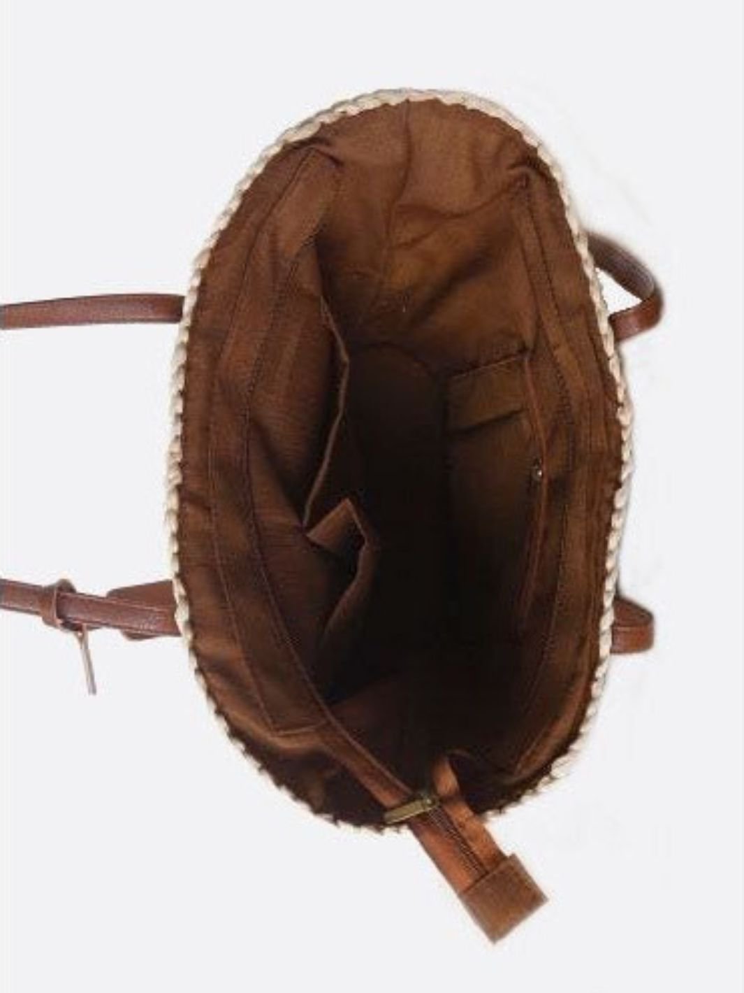 This tote bag is made of woven wicker with polyurethane leather handles. It is composed of a main compartment, two flat pockets and a zipped pocket. It is mainly worn on the shoulder.