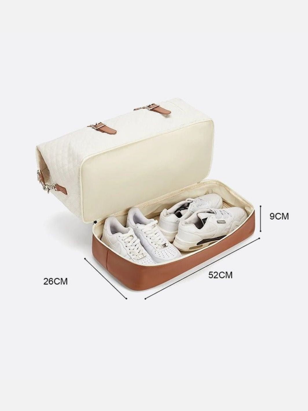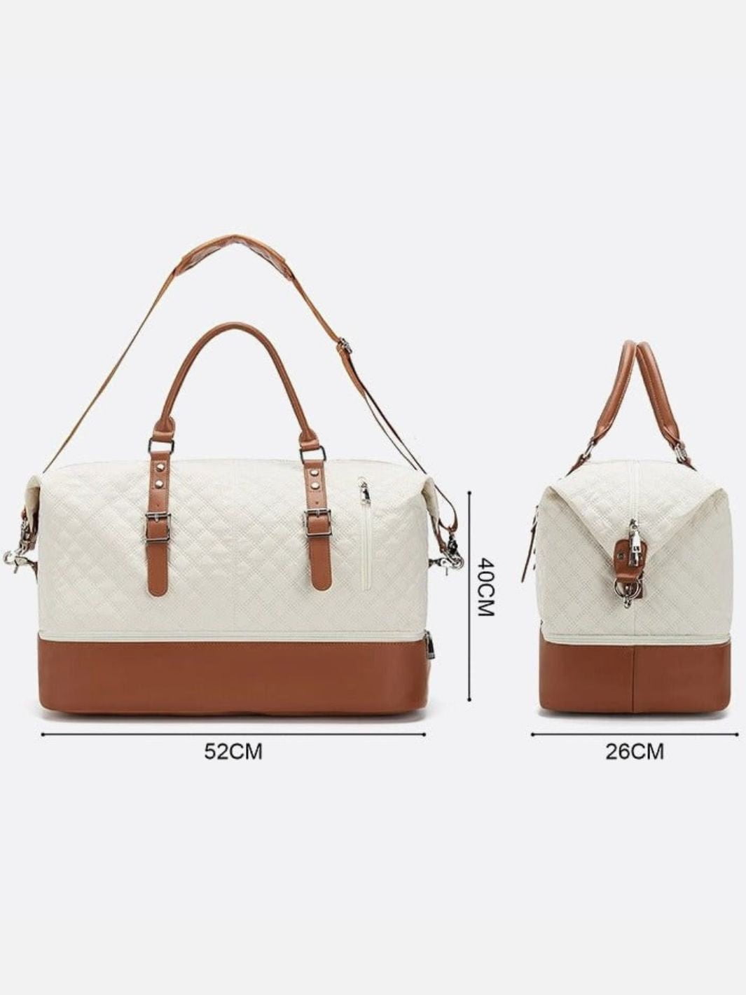 Very functional with its multiple storage spaces, this quilted travel bag also brings you a chic and elegant style with its nylon and leather material duo. Inside this travel bag, you have several pockets to easily store your belongings, as well as compartments for your laptop and digital tablet. The shoe compartment below gives you the possibility of carrying up to two pairs of shoes, and the suitcase attachment on the back allows you to use this bag in addition to your main luggage during your long stays.